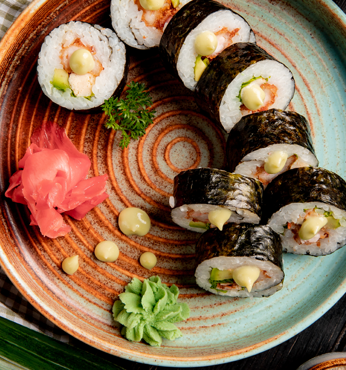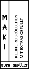 Maki bedeutet »gerollte Sushi«. Diese klassischen Röllchen aus Nori (Seetangblättern) werden mit einer Bambusmatte (Makisu) von Hand gerollt und gefüllt mit gesäuertem Reis und verschiedenen Extras wie rohem Fisch, Meeresfrüchten, Gemüse oder auch japanischem Omelette.