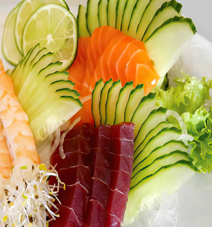 Bei Sashimi spielt der rohe, fein filetierte Fisch die Hauptrolle. Ausschließlich bestes Filet wird mit einem speziellen Messer (Hocho) in drei bis vier Millimeter dünne Scheiben geschnitten und kunstvoll mit Gemüse garniert serviert. Auf Reis oder andere Beilagen wird meist verzichtet.