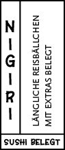 Das Wort Nigiri bedeutet »von der Hand gemacht«. Nigiri sind längliche, von Hand geformte Reisbällchen, die mit Fisch, Meeresfrüchten oder Gemüse belegt werden. Manchmal sind sie mit einem schmalen Seetangblatt (Nori) umwickelt.